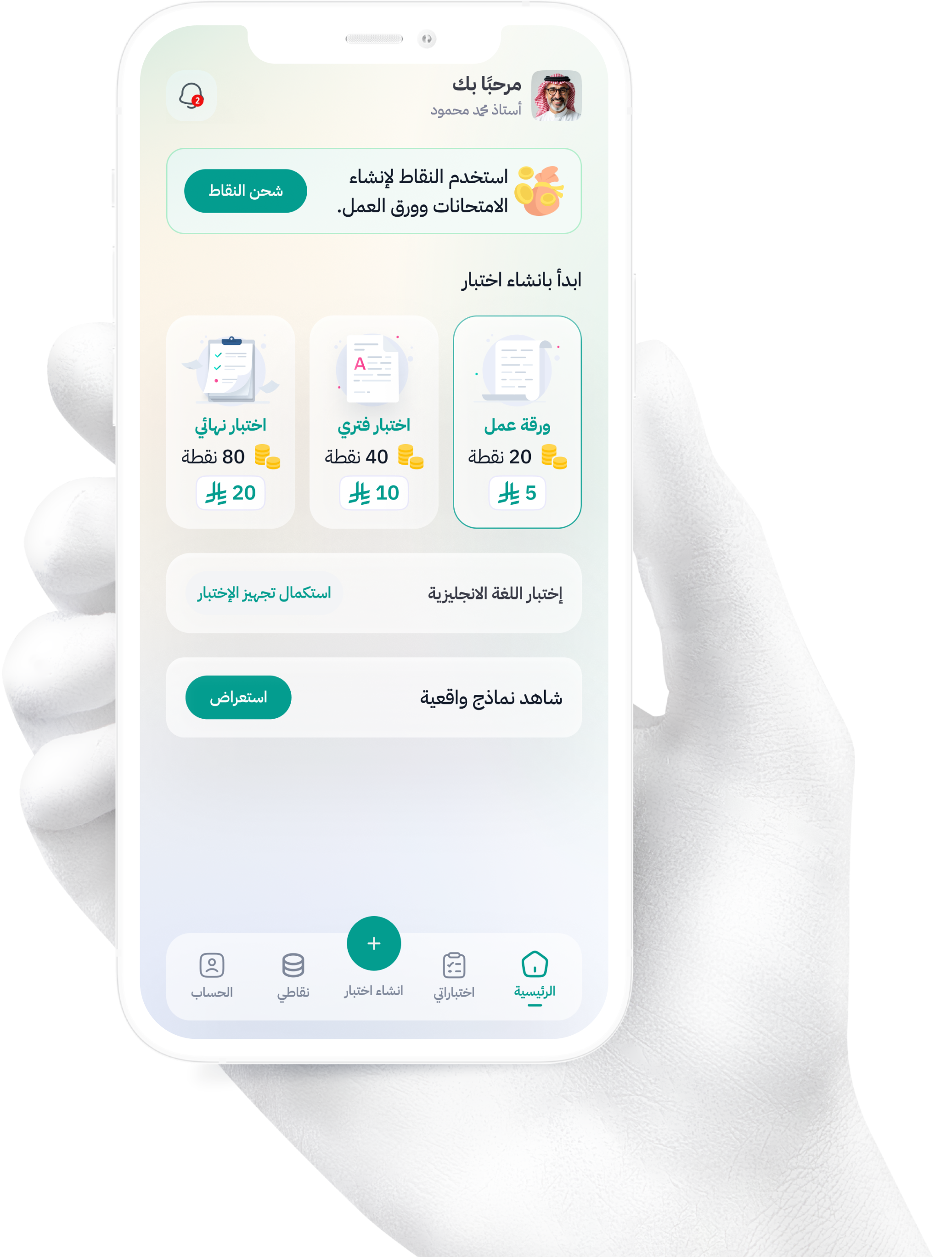 من جوالك تقدر تدير اختباراتك بسهولة، تنشئ، تعدل، وتشارك الطلاب مباشرة. تطبيقنا يعطيك نفس التجربة السلسة للمنصة وبإمكانك تستخدمه بأي وقت وأي مكان.